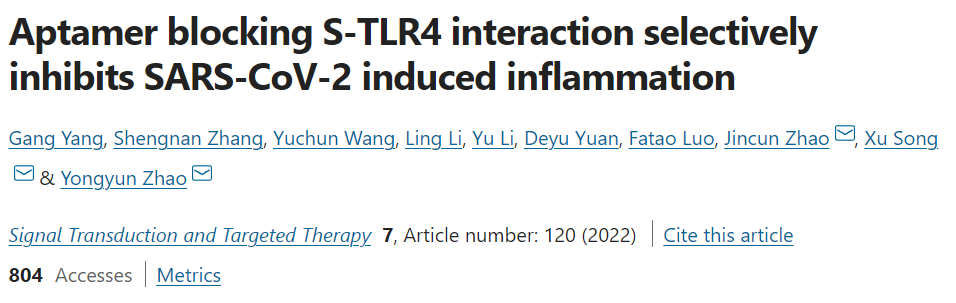 近日,金沙威尼斯欢乐人城宋旭教授/赵永云课题组在国际权威期刊Signal Transduction and Targeted Therapy(IF=18.187)发表题为Aptamer Blocking S-TLR4 Interaction Selectively Inhibits SARS-CoV-2 Induced Inflammation的文章,筛选和鉴定了可抑制SARS-CoV-2诱发的炎症的核酸适配体,该核酸适配体通过特异性阻断Spike蛋白与TLR4受体相互作用,高选择性地抑制SARS-CoV-2病毒所诱发的炎症。